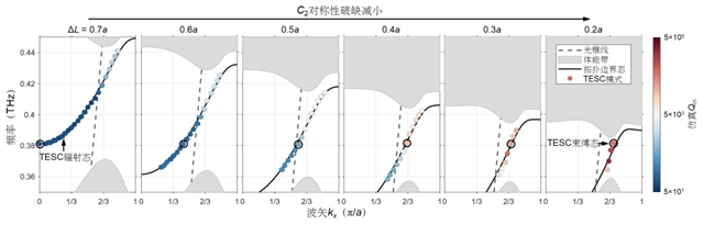 由于TESC的谐振模式源自拓扑边界态,因此改变边界态本身的特性为调控TESC的Qin和FSR提供了新的自由度。如图3所示,通过改变拓扑能谷光子晶体的面内180° 旋转对称性(C2),拓扑边界态可从光锥线上方移至下方,同时能带斜率变陡,即群折射率降低。因此,调节C2对称性破缺的程度,可实现TESC从辐射态到束缚态的转变。