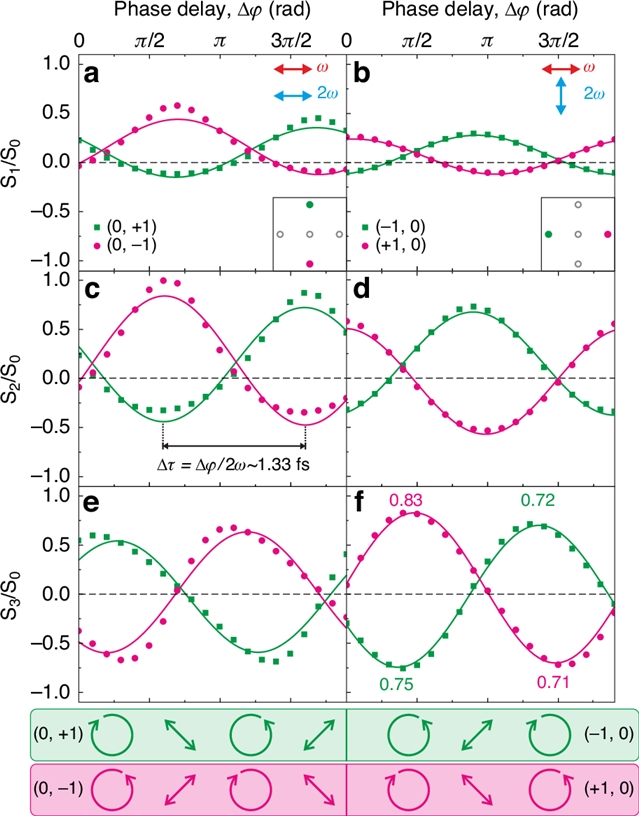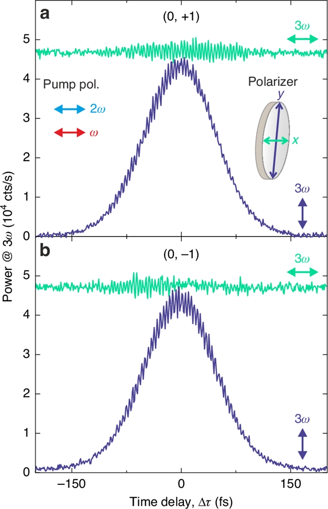 如图3所示,通过插入线偏振片进一步验证(0, ±1)级次中SFG与THG的正交偏振。实验中,在检测路径插入线偏振片,分别沿x轴(水平)和y轴(垂直)方向选择偏振分量,测量(0, ±1)级次的光强随延迟的变化(图3a和b)。结果显示,当偏振片沿x轴时,光强与延迟无关(绿色轨迹),对应THG信号(由基频ω单独激发,与2ω脉冲的时间重叠无关);当偏振片沿y轴时,光强呈现钟形分布(蓝色轨迹),对应SFG信号(由ω与2ω脉冲的时间重叠激发)。这一结果明确分离了SFG与THG的偏振分量,证实两者在(0, ±1)级次中分别沿y轴和x轴偏振,且正交。此外,通过调整ω与2ω泵浦光的功率(ω泵浦11 mW,2ω泵浦22 μW),实现了SFG与THG功率的平衡,为后续圆偏振生成奠定了基础。