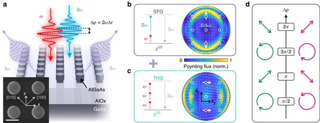 近日,意大利米兰理工大学Marco Finazzi、Michele Celebrano团队聚焦于全介质超表面(AlGaAs纳米柱阵列)在非线性光学中的偏振调控能力,通过控制泵浦光(ω)与其倍频光(2ω)的相对相位,实现了上转换光(3ω)偏振态从线偏振到圆偏振的动态调制(圆偏振度DoCP高达83%),以及远场衍射级次中对称分布相反手性的圆偏振光。该工作通过非线性干涉机制,在简单全介质超表面上实现了上转换光的全光偏振动态调控,为超表面在非线性偏振控制、手性传感及高级成像等领域的应用提供了新思路。
