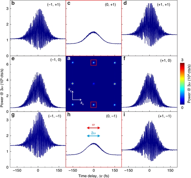图2通过实验验证了SFG与THG在特定衍射级次的正交偏振特性。图2a为3ω上转换光的后焦面平均图像(通过40帧延迟间隔1 fs的图像平均获得),清晰显示了超表面的各个衍射级次(如(0, ±1)、(±1, 0)等)。图2b至i为各衍射级次在-200 fs至+200 fs延迟范围内的光强变化轨迹(时间延迟分辨率1 fs)。实验发现,除(0, ±1)级外,其他衍射级次(如(±1, 0))的光强随延迟变化呈现明显的干涉条纹(由SFG与THG的相位差调制引起);而(0, ±1)级的光强变化几乎无干涉(图2c和h的红色方块),表明该级次中SFG与THG的偏振正交,干涉效应被抑制。这一结果直接验证了模拟预测的SFG与THG在(0, ±1)级次的正交偏振特性,为后续偏振调控提供了实验基础。