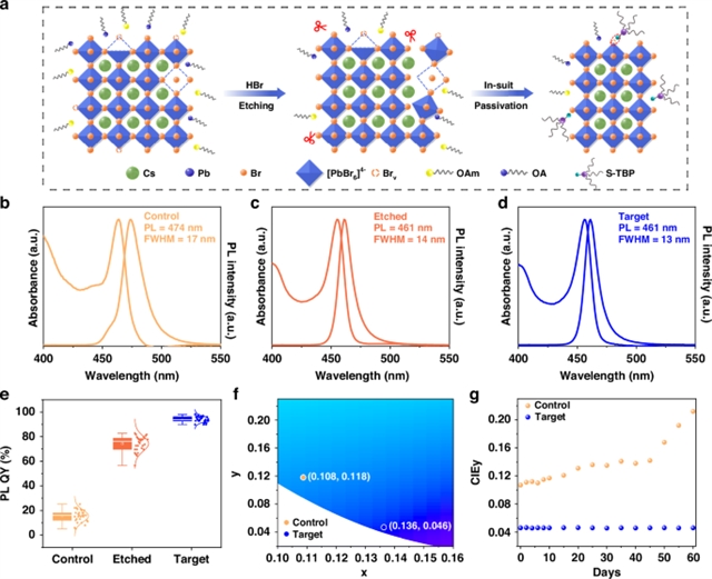研究团队提出了一种酸辅助的配体钝化策略,通过质子辅助剥离弱结合的长链配体(油胺和油酸),再引入短链三丁基膦-硫(S-TBP)配体钝化CsPbBr3 NPLs。钝化后的CsPbBr3 NPLs展现出优异的光学特性:光致发光量子产率从最初的19%显著提升至96%,发射峰位保持在461 nm,半高宽仅为13 nm,CIE-y值低至0.046。同时,该胶体溶液在存放60天后仍保持出色的色纯度,显示出良好的稳定性。