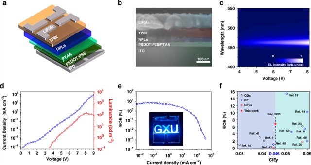 图3:基于 CsPbBr3 NPLs的PeLED的电致发光性能。