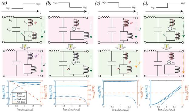 图3针对色散介质(如等离子体频率调制的Drude模型),用串联电感模拟自由电子惯性,展示了等离子体频率突变时的四种场景。图3a为等离子体频率增加且电流守恒的场景:短路电感导致磁通量流失,能量和动量分别减少约25%和15%,类比于粒子携带动量离开系统;图3b为等离子体频率减少且电流守恒的场景:需通过电压源注入磁通量以保持电流连续,能量和动量均增加约45%和25%;图3c为等离子体频率减少且磁通量守恒的被动场景:开路电感导致电流重新分配,动量守恒但能量减少约35%;图3d为等离子体频率增加且磁通量守恒的主动场景:需注入磁通量以维持守恒,能量增加约55%且动量守恒。子图底部的曲线同样量化了能量和动量的变化,同时揭示了色散介质中DC/扭摆模式的存在,进一步验证了非色散与色散介质时间界面的对偶性(电荷对应磁通量,D守恒对应电流守恒)。