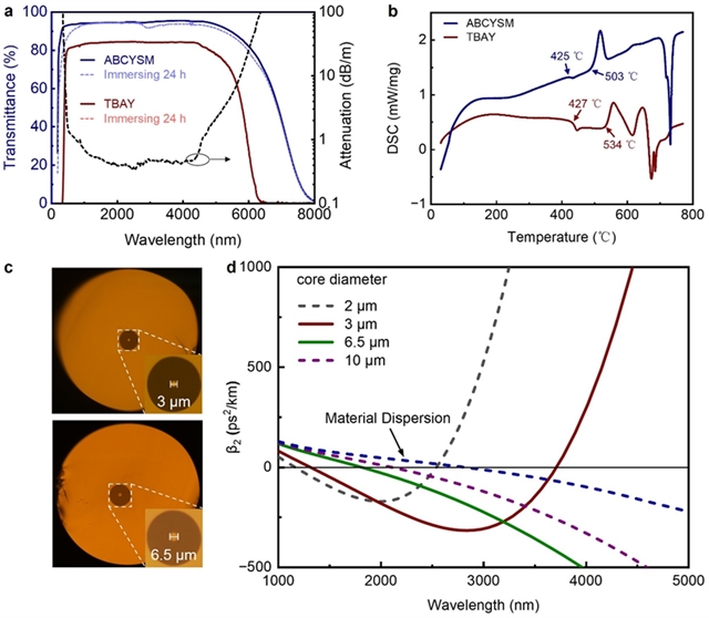 图1. TBAY和ABCYSM玻璃的特性。a. 浸水实验前后的透射光谱和纤芯衰减曲线;b. DTA曲线;c. TBAY光纤样品的显微镜图像;d. TBAY光纤不同芯径的色散曲线。