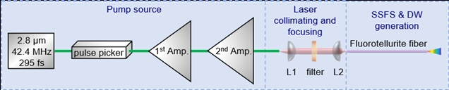 TBAY光纤包层材料采用低折射率的ABCYSM 玻璃(35AlF3-10BaF2-20CaF2-15YF3-10SrF2-10MgF2),使其具有很高的数值孔径(NA≈1.1@3.5 μm),这一特性为光纤的色散设计提供了极大的灵活性,可以通过调整纤芯的直径对光纤的色散进行调控(图1c-d)。采用 100 kHz 低重频3.54 μm飞秒激光泵浦源(图2),最高峰值功率可达950 kW ,在短光纤内快速激发孤子自频移效应与色散波生成。