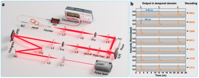 团队搭建了3 bit数据的OAM-STM系统并成功采集到特征化的时域脉冲序列波形(图 2)。系统采用10 ps脉宽的锁模超快脉冲激光,通过计算全息技术利用数字微镜器件(DMD)生成携带 “001” 至 “111” 数据的 OAM 光束(拓扑荷l∈[1,3]),经过单层 D2NN 调控后,光束能量被聚焦到三个目标 “激活区域”;配合 2 m、4 m、6 m 长度的光纤延迟线,使不同 OAM 模式对应的时间脉冲时延为 9.48 ns。实验成功在时域得到了具有不同脉冲分布特征的时域波形,通过设置强度阈值为0.6,时间脉冲序列可准确解码3 bit数据,验证了技术可行性。