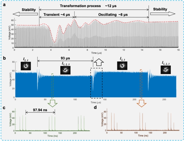 然而,传统OAM复用技术存在两大根本性局限:其一,仅依赖空间域进行信号调控,随着复用模式数量增加,系统架构复杂度呈指数级上升,模态串扰问题显著加剧,解复用效率大幅衰减,可扩展性遭遇瓶颈;其二,现有混合复用方案(如结合波长、偏振维度)多依赖连续波(CW)激光与外部调制器,在大气湍流、水下散射等复杂环境中抗干扰能力不足。值得注意的是,脉冲激光具备高峰值功率、强环境抗干扰性等天然优势,且多数先进OAM发生器本身即可直接输出脉冲模式光束,能显著简化系统架构,但脉冲时间间隔受重复率固定限制,导致时间维度未被有效开发,形成数据吞吐量的关键制约。