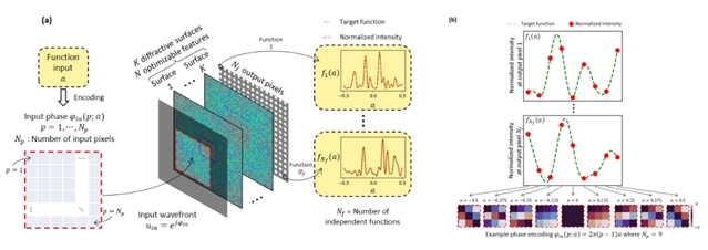 图1:大规模并行的衍射光学非线性函数计算:(a) 输入函数被编码至光波前的相位中,经衍射光学处理器传播后,各输出像素处的光强对应相应函数的输出值。(b) 输出非线性函数的拟合结果