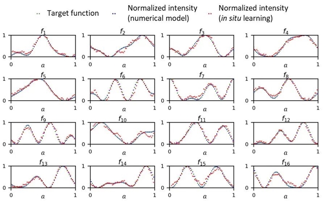 研究团队还进行了实验验证,证明了该系统同时学习并执行多种非线性函数的能力。在实验中,团队对35个不同的非线性函数进行了学习,当系统收敛后,输出光强能够准确地再现目标函数的非线性关系(图3)。这一结果验证了衍射光学处理器在真实物理系统中可实现多函数并行非线性计算的可行性。