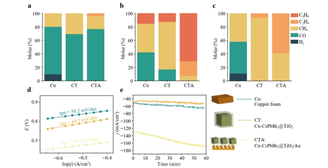 图3:以泡沫铜(Cu)为参照,比较以下三种电极的催化性能: a) 电催化(EC); b) 光催化(PC); c) 光电催化(PEC)。所用电极分别为:纯铜泡沫(Cu)、浸渍原始 CsPbBr3@TiO2 的铜泡沫(CT),以及在 Au 纳米颗粒上沉积 CsPbBr3@TiO2 核-壳纳米颗粒的铜泡沫(CTA)。d) Cu、CT 和 CTA 在 60 min 内的 Tafel 曲线。e) Cu、CT 和 CTA 的计时电流曲线