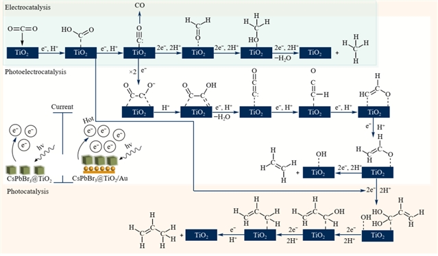 基于实验结果,研究团队提出了可能的反应路径(图4)。在所有催化过程中,第一步都是CO2脱氧生成吸附在TiO2表面的CO。在光电催化条件下,CsPbBr3@TiO2/Au独特的S型异质结和等离激元效应提供了丰富的电子,促使两个CO分子偶联形成OCCO二聚体中间体,进而加氢生成乙烯。而对于丙烯的生成,推测可能源于乙烯醇中间体(C2)与另一个C1中间体(*C1)在TiO2表面的耦合。