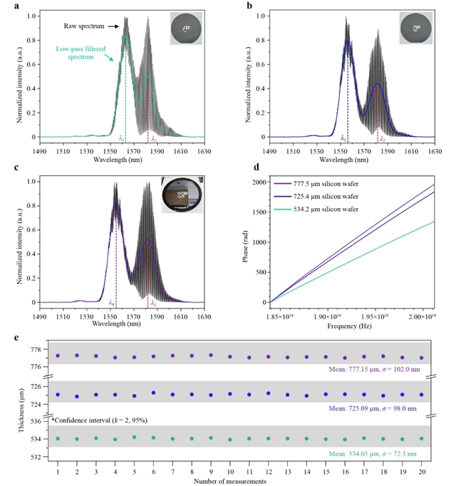针对硅折射率随工艺条件(如掺杂、温度)波动而导致单一干涉测量存在系统误差的问题,本研究提出了一种无需Z轴机械扫描的同步测量方案。该方法通过数学模型联立色差共焦获取的几何距离信息与光谱干涉获取的光学厚度信息,成功实现了物理厚度与群折射率的同步解算。实验数据显示,在对标称厚度为534.2 µm的硅晶圆进行测试时,该系统不仅消除了折射率非均匀性的影响,更实现了72.3 nm的测量重复性,合成标准不确定度为560.7 nm (k=1),证实了该方法在从“光学厚度”推算“几何真值”方面的极高可靠性。