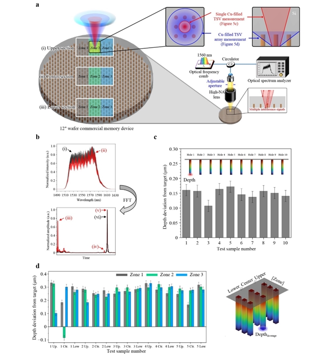 针对正面金属层不透光的物理限制,韩国科学技术院(KAIST)联合三星电子,采用背照式(Backside Illumination)策略,即让光线穿透硅衬底“从后方”探测目标 。结合光学频率梳的高精度测距能力,这项基于光梳的背照式新技术,在不破坏芯片的前提下精准测得了内部微孔的深度 。该研究利用 1560 nm 红外光学频率梳,结合色差共焦与光谱干涉技术,成功穿透硅衬底,实现了对晶圆厚度与折射率的同步测量,并对微细 TSV 的深度进行了亚微米级精度的无损表征,为先进封装良率管理提供了全新的无损解决方案 。