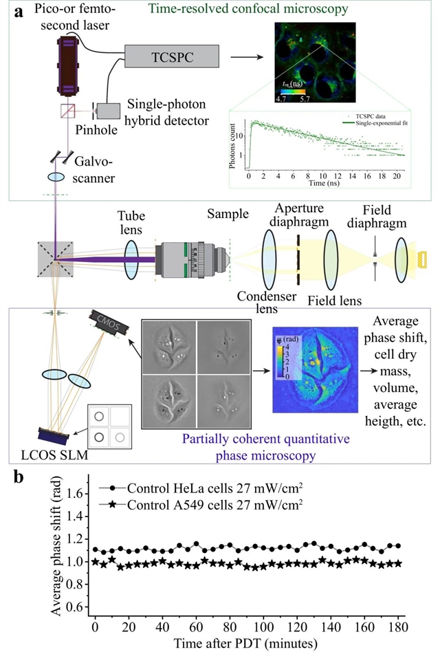 多维度同步检测活细胞信息在生物医学研究中具有重要意义。然而,现有光学成像方法在形态学量化、代谢状态评估以及外源性小分子摄取监测方面往往各自独立,难以同时从同一细胞中一致性的数据集。特别是在光动力治疗(PDT)等涉及快速光生理反应的研究中,缺乏能够同时记录形态与代谢变化的成像体系显著限制了细胞死亡机制的精确解析。