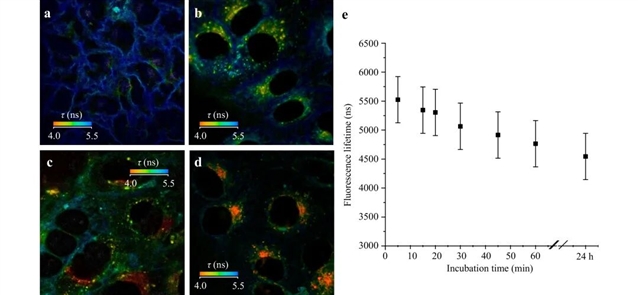 如图3所示,由a-d分别表示Hela细胞摄取光敏剂后时间为2 min,30 min,60 min和24 h的寿命成像图,结果显示随着时间增加,光敏剂Radachlorin 逐渐从细胞膜富集到细胞质再进一步富集到细胞核中周围,荧光寿命也逐渐缩短,由 5.5ns变为最终的 4ns 的区域。孵育 24 小时后,Radachlorin 主要定位于核周区域。