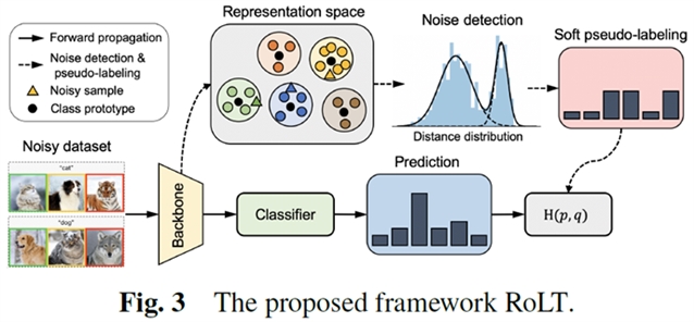 传统的小损失标准无法区分尾部类的干净样本和噪声样本。相比之下,逐类样本距离度量则更加稳健。具体来说,首先在嵌入空间中计算样本与其类原型之间的距离,然后选择小距离样本作为干净样本。在此基础上,通过进一步结合软伪标签技术,研究人员提出了稳健的长尾学习框架RoLT。