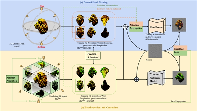 在AI生成创意内容(AIGC)领域,从文本描述生成三维物体引起了广泛关注。文本到三维(Text-to-3D)技术正在深刻影响计算机辅助设计(CAD)、游戏、虚拟现实和艺术创作等多个领域。然而,生成过程面临着一致性差和分辨率低等问题,主要原因在于缺少关键的视觉线索,如视角和属性。此外,渲染中的随机约束可能影响模型推理,导致“Janus问题”。由国防科技大学邓劲生、徐明两位教授领衔的计算机人工智能与大数据实验室近期在AIGC领域推出文本生成三维物体的去除多头优化技术,取得了性能上的显著进展。为了解决这些问题,该文提出了HexaDream框架,用于生成高质量的三维内容。Hexaview生成扩散模型旨在将物体类型、属性和视角特定的文本融合到统一的潜空间中。此外,特征聚合注意力机制显著增强了生成结果的细节和一致性,通过将正交视角中的点特征映射到三维领域,进一步提升了生成效果。