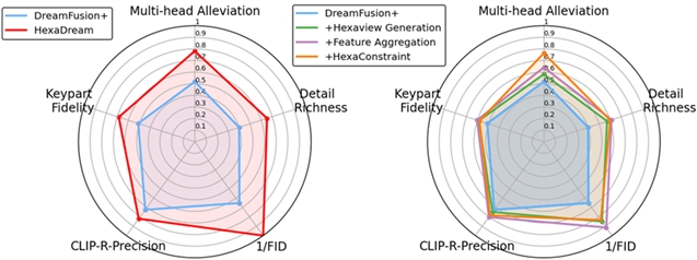 通过在多个基准数据集上的实验,该文的HexaDream模型在关键指标上取得了显著的改进,例如CLIP-R、Keypart Fidelity和Multihead Alleviation。在与现有方法的比较中,HexaDream在CLIP-R上提高了8%,在Keypart Fidelity上提高了12%,特别是在Multihead Alleviation上提高了20.6%。该文还通过对比实验验证了不同模块对模型性能的贡献,实验结果显示,通过引入六个正交视角、特征聚合注意力机制以及动态加权HexaConstraint模块,HexaDream有效解决了现有方法中常见的多头问题和一致性问题,进一步提升了从文本生成高质量三维物体的能力。