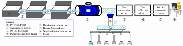 串联连片农田在线监测系统布置在连片农田地势较低的一侧。主要由导流槽、在线流量计、动态采集装置、数据传输装置、数据采集装置、无线传输装置和客户端组成 (图1)。