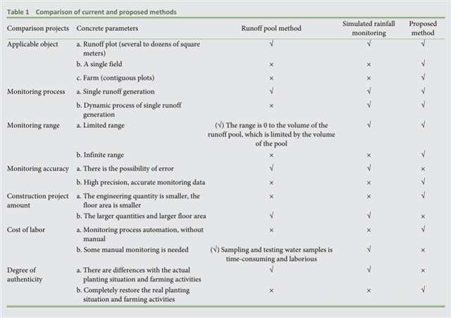 与现有的农田径流监测方法相比,该系统能够实时监测径流过程,适用于连续性径流和间歇性径流的监测 (图 Graphical abstract)。同时,监测精度得到了大幅提升 (表1)。