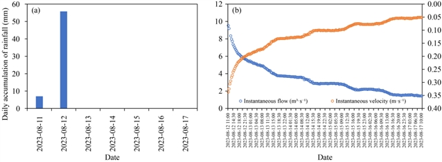 在6月至10月农田降雨排水期间,每隔半小时监测一次监测点的流量和流速。在极端暴雨事件期间,监测频率加密,对流量和流速进行了密集监测。7月29日,受台风影响,华北平原发生极端降水事件。该监测点位于降水中心,因此对降水和径流流量进行了加密监测,实时掌握监测点的径流流量。通过将现场数据与气象数据进行对比,进一步验证了设备的可靠性。8月11日,白庄村再次发生降水。从监测数据可以看出,8月11日开始降雨,8月12日降雨增多,但8月12日11:00监测到径流且流量逐渐增大,说明径流的产生具有滞后性。通过现场应用,进一步证实了该装置的可靠性 (图3)。