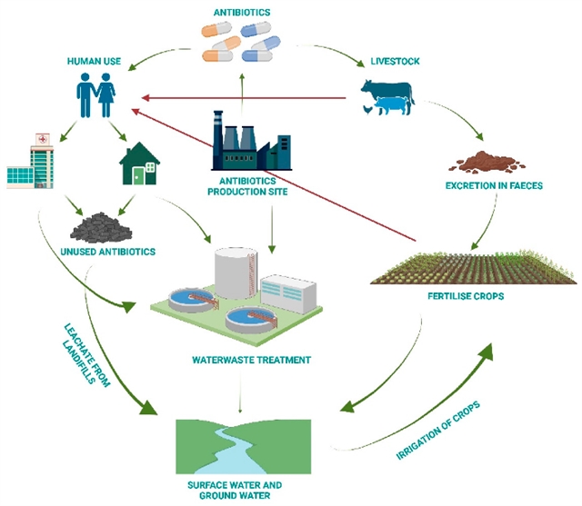 图2:环境中抗生素的来源与潜在去向。抗生素残留物在环境中的主要扩散来源包括抗生素生产、人类使用及畜牧养殖。这些物质在主要污水处理设施中的持久存在、从垃圾填埋场渗入土壤的过程以及受污染水体的使用,共同构成了潜在的人类健康风险。