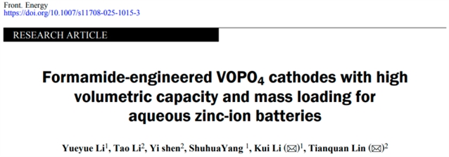 Yueyue Li, Tao Li, Yi shen, Shuhua Yang, Kui Li, Tianquan Lin. Formamide-engineered VOPO4 cathodes with high volumetric capacity and mass loading for aqueous zinc-ion batteries. Front. Energy, https://doi.org/10.1007/s11708-025-1015-3
