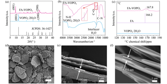 通过水热结合超声处理法,将FA原位插入VOPO4·2H2O层间,成功制备了FA-VOPO4纳米片材料。结构表征表明,FA的插层使VOPO4的(001)衍射峰从11.9°偏移至9.4°,层间距由7.4 Å显著扩大至9.3 Å,为Zn2+迁移提供了更宽敞的通道。傅里叶变换红外光谱(FTIR)与X射线光电子能谱(XPS)的N 1s谱进一步证实FA分子成功嵌入并部分替代层间水;固体13C核磁共振(NMR)显示FA的C=O峰位移,表明FA与残留水通过氢键相互作用,增强了层间结构稳定性。扫描电子显微镜(SEM)观察到FA-VOPO4纳米片厚度显著小于未改性的VOPO4·2H2O,进一步优化了离子传输路径。