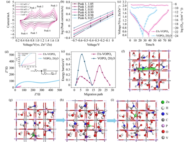 反应机理研究通过微分电容(dQ/dV)曲线发现,FA-VOPO4在循环中逐渐转化为VOx相,但仍保持较高电化学活性。原位XRD与XPS分析证实,FA-VOPO4在充放电过程中呈现可逆的层间距变化((200)峰偏移)与钒价态转换(V4+/V5+↔V3+/V4+),并伴随Zn2+的可逆插入/脱出。动力学研究显示,FA-VOPO4的电容行为主导电荷存储,Zn2+扩散系数显著高于VOPO4·2H2O;电化学阻抗谱(EIS)进一步表明其电荷转移电阻更低。密度泛函理论(DFT)计算揭示,FA插层将Zn2+扩散能垒从0.60 eV降至0.38 eV,有效提升了离子迁移动力学。