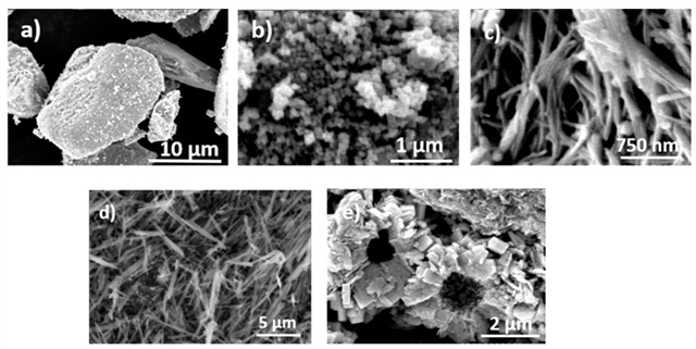 根据过往研究表明,纳米材料的形貌对光催化性能有显著影响。为了探索如何提高光催化效率,Heagy与其研究团队系统制备并对比了五种不同形态的氧化钨材料:微米颗粒、纳米粉末、纳米棒、纳米线和花状结构。