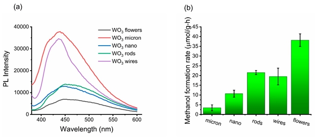 示意图(a)为WO3颗粒的光致发光光谱;(b)为不同形貌样品在2 mM H2O2存在下的甲醇生成速率(反应条件:50°C,pH~7,紫外光照射,CH4/N2混合气以100 mL/min流速鼓泡)。