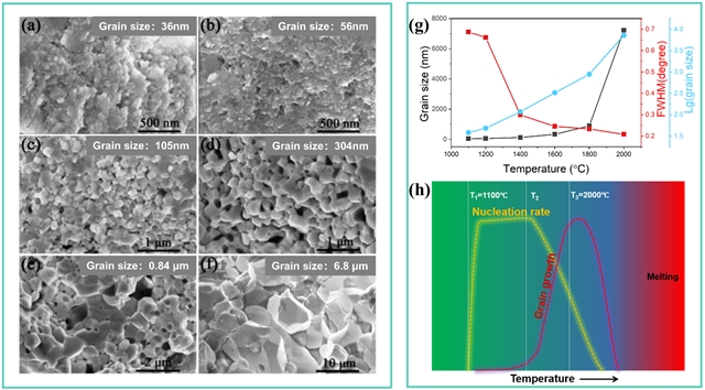 图2. 不同温度下制备的TaB2样品扫描电镜图像:(a) 1100 ℃,(b) 1200 ℃,(c) 1400 ℃,(d) 1600 ℃,(e) 1800 ℃,(f) 2000 ℃。(g) 晶粒尺寸及X射线衍射峰半高宽(FWHM)随合成温度的变化曲线。(h) 成核速率与晶粒生长随温度变化示意图。