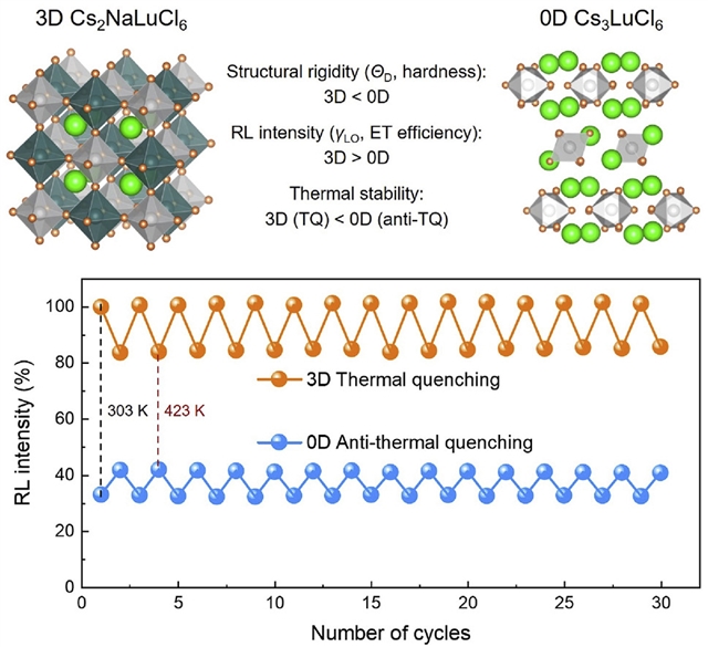 本研究在低温条件下成功制备出稀土掺杂的3DCs2NaLuCl6与0DCs3LuCl6钙钛矿,兼具优异的热稳定性与相机匹配的发射光谱。3D相Debye温度ΘD达201 K,硬度仅0.23 GPa,电子-声子耦合强度γLO为141 meV,因此在423 K仍保留85%的室温亮度,热衰减轻微;0D相ΘD升至238 K,硬度增至0.32 GPa,γLO降至102 meV,相同温度下亮度反而升至130%,呈现显著抗热衰减。凭借更强的电子-声子耦合,3D闪烁体的RL强度整体高于0D;而3D(Ce-Sm)、3D(Tb)与0D(Tb)兼具高RL输出和红/绿发射,使X射线图像更亮。高温成像测试表明,两相空间分辨率均无退化。本工作揭示了结构刚性对稀土卤化物钙钛矿热稳定发光的关键作用,为高温X射线成像闪烁体的开发开辟了新路径。