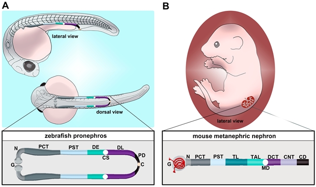 图1. 斑马鱼与小鼠肾元组成情况的比较。