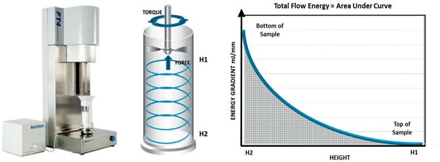 食品粉末流动性的测量是一项精细而复杂的工作。传统方法如休止角、卡尔指数(Carr Index)、豪斯纳比(Hausner Ratio)及剪切单元测试(powder flow function)等,可为粉末的基本流动特性提供初步评估。随着技术进步,粉末流变仪已成为精准表征流动性的先进工具。例如,Hausmann等近期研究利用粉末流变学技术,有效揭示了湿度对氯化钠粉末流动能量的影响规律,特别是在测试的下降、旋转及上升循环阶段。流变学测量的核心在于量化粉末的流动阻力;以FT4粉末流变仪为例,其通过测量旋转叶片在受控样品中沿设定路径移动时所受的阻力,将记录的扭矩与作用力数据转化为单一参数——流动能,从而实现对材料流动性的精确表征。