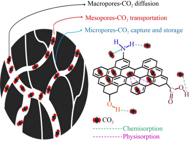 图1 生物炭的孔隙结构及二氧化碳在生物炭上的吸附机理