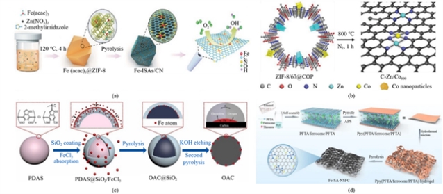 空间限域效应则通过纳米级空间限制金属原子迁移。例如,ZIF-8封装Fe(acac)3前驱体,高温热解后可形成均匀分散的Fe-N4位点。此外,多孔结构设计与二次掺杂可进一步提升位点的暴露与负载量,例如Fe-N-C-meso-evap催化剂通过硫酸诱导介孔结构,显著增强了Fe-Nx位点的稳定性与可及性。