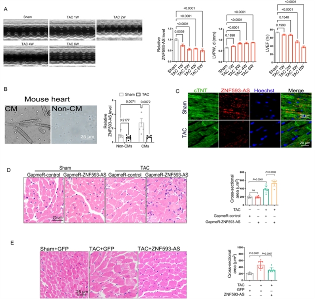 为明确ZNF593-AS在心脏肥大中的作用,研究团队首先构建了左心室肥大的小鼠模型,并在心肌细胞中使用肥大激动剂苯肾上腺素(PE)处理。结果发现,ZNF593-AS的表达在两种模型中均显著降低(图1)。进一步的体内实验中,通过CRISPR/Cas9系统构建了ZNF593-AS基因敲除小鼠,发现敲除ZNF593-AS会加剧压力过载(经主动脉缩窄术,TAC)诱导的心脏肥大,表现为心脏重量/体重比增加、心肌细胞横截面积增大,左心室壁厚度显著增厚(图2);而心肌细胞特异性过表达ZNF593-AS的转基因小鼠(ZNF593-AS MHC-Tg)则展现出TAC诱导的心脏肥大减轻的表型,上述指标均得到改善(图3)。体外实验中,在人心肌细胞(AC16细胞)和小鼠心肌细胞(HL-1细胞)中分别过表达或敲低ZNF593-AS,结果显示过表达ZNF593-AS可缓解苯肾上腺素诱导的心肌细胞肥大,而敲低则加剧了肥大表型,且这种抗肥大作用在人与小鼠之间具有保守性(图4)。