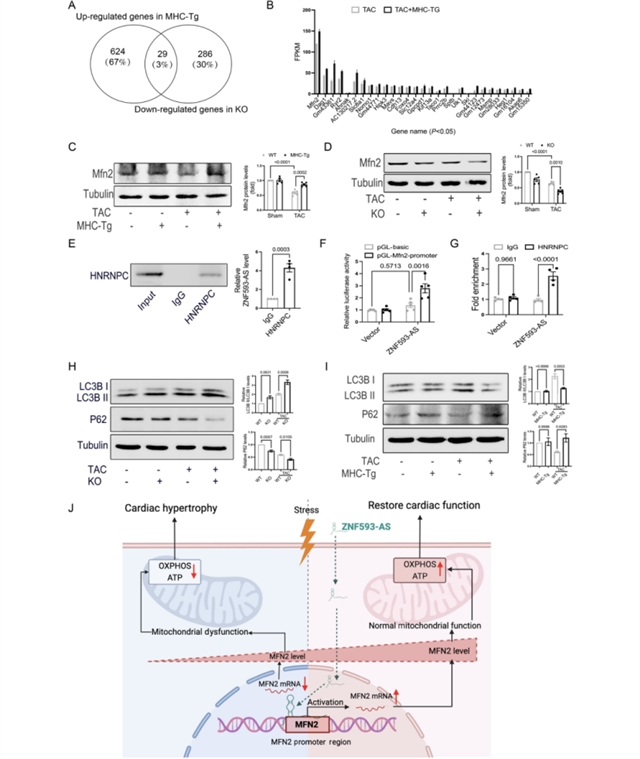 为探究ZNF593-AS发挥作用的分子机制,研究团队对ZNF593-AS敲除和转基因小鼠的心脏组织进行了RNA测序和基因集富集分析,发现氧化磷酸化通路在两组小鼠中均发生显著变化(图5)。进一步检测氧化磷酸化相关蛋白发现,ZNF593-AS过表达可缓解TAC诱导的SDHB、UQCRC2和ATP5A等蛋白表达降低,并逆转心脏ATP水平的下降;而敲除ZNF593-AS则加剧了这些变化,同时体外敲低ZNF593-AS还会降低细胞的氧化磷酸化水平并增加活性氧的生成。通过对差异表达基因的筛选,研究团队确定Mfn2是ZNF593-AS的直接靶基因。实验证实,ZNF593-AS敲除会显著降低Mfn2表达,而过表达则增加其表达,且ZNF593-AS通过与RNA结合蛋白HNRNPC相互作用,直接结合Mfn2启动子区域以促进其转录(图6)。此外,ZNF593-AS还通过调控Mfn2表达影响线粒体自噬,敲除ZNF593-AS会加剧TAC诱导的自噬异常,而过表达则可逆转这一现象。