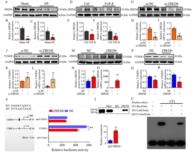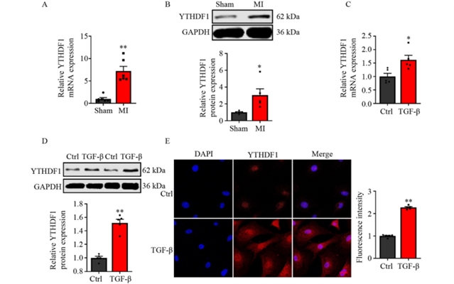 在心血管疾病领域,心肌纤维化是心肌梗死等损伤后常见的病理改变,其特征是心脏成纤维细胞过度活化、细胞外基质蛋白异常沉积,最终导致心脏结构重塑和功能下降,进而引发心力衰竭。尽管转录调控在心肌纤维化中的作用已被广泛研究,转录后调控机制,尤其是RNA修饰在这一过程中的作用仍知之甚少。N6-甲基腺苷(m6A)作为信使RNA上最常见的化学修饰之一,参与调控RNA的稳定性、剪接、出核及翻译等过程,其在心血管疾病中的功能正逐渐受到关注。m6A阅读蛋白YTHDF1被认为能够促进特定mRNA的翻译效率,但其在心肌纤维化中的具体作用尚未明确。