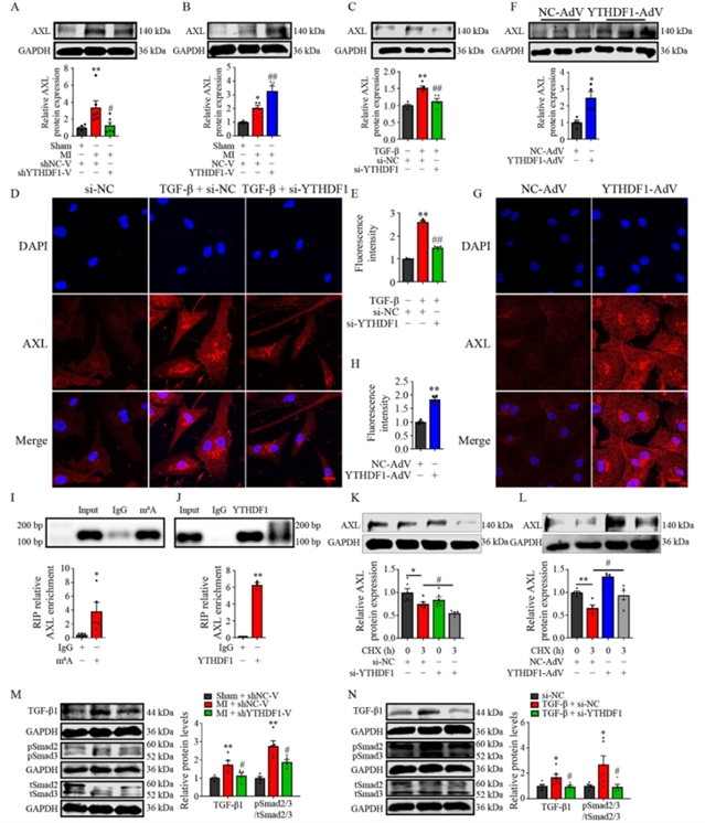 哈尔滨医科大学药学院杨宝峰、卞宇、Hongtao Diao等系统探讨了YTHDF1在心肌纤维化发生发展中的功能及其分子机制。本研究综合运用了在体心肌梗死模型和体外转化生长因子-β诱导的心脏成纤维细胞活化模型,结合腺相关病毒介导的基因敲降与过表达技术,揭示了YTHDF1通过增强受体酪氨酸激酶(AXL)的翻译,进而激活TGF-β–Smad2/3信号通路,从而促进心肌纤维化的新机制。