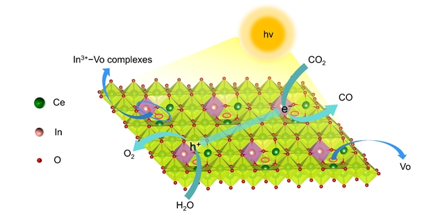 在空位缺陷调控中,金属离子的配位环境对缺陷功能具有关键影响。异价掺杂可调节局部配位结构,诱导不对称空位形成并引起电荷重排,为增强Vo稳定性提供了可行路径。本研究提出一种In掺杂策略,通过调控CeO2中Ce–O配位环境,构建In3+–Vo复合体,以同时提升Vo稳定性与催化活性。结果表明,In3+取代Ce4+后形成的In3+–Vo复合体有效抑制了不稳定空位团簇的生成,显著增强Vo的稳定性。在模拟太阳光下,In-CeO2-x的CO生成速率达60.32 μmol·g−1·h−1,选择性接近100%,分别为商用CeO2、无Vo的CeO2及仅含Vo的CeO2-x的53倍、24倍和11倍,且在四次循环后仍保持高活性。该研究揭示了In3+–Vo复合体通过调控局部配位环境,在增强Vo稳定性的同时优化反应路径,为高效稳定的CeO2基光催化剂设计提供了新思路。