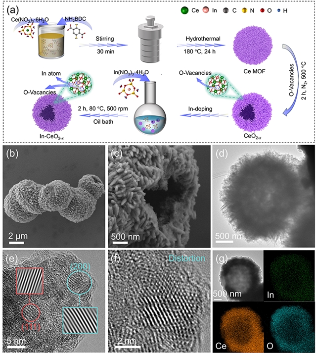 图1. In-CeO2-x的(a)制备过程示意图,(b,c)SEM图像,(d–f)HRTEM图像和(g)STEM元素映射。