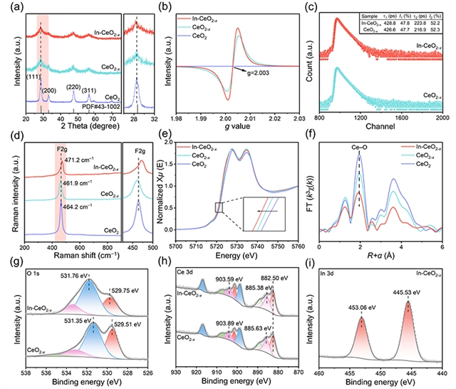 图2. CeO2、CeO2-x和In-CeO2-x的(a)XRD谱图和(b)EPR图谱。(c)CeO2-x和In-CeO2-x的PALS光谱。CeO2、CeO2-x和In-CeO2-x的(d)拉曼光谱、(e)归一化Ce L3边缘XANES和(f)FT-EXAFS。CeO2-x和In-CeO2-x的高分辨率(g)O 1s、(h)Ce 3d和(i)In 3d XPS光谱。