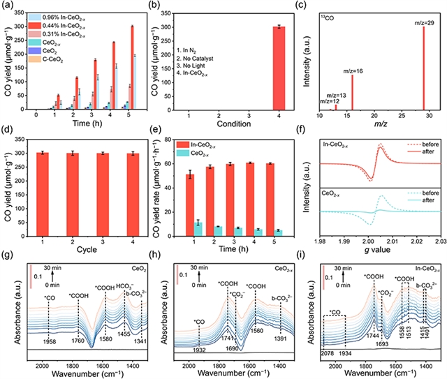 图3.(a)C-CeO2、CeO2、CeO2-x和In-CeO2-x的光催化活性比较。(b)不同条件下In-CeO2-x的光催化性能。(c)In-CeO2-x的13C同位素标记试验。(d)In-CeO2-x的稳定性试验。(e)光催化CO2在CeO2-x和In-CeO2-x上转化过程中CO生成速率的演化。(f)光催化CO2还原前后CeO2-x和In-CeO2-x的EPR光谱。(g–i)随辐照时间增加,CO2光还原在(g)CeO2,(h)CeO2-x和(i)In-CeO2-x上的原位漫反射红外光谱(In-DRIFTS)。