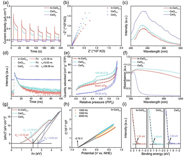 图4. CeO2、CeO2-x和In-CeO2-x的(a)瞬态光电流响应、(b)电化学阻抗谱(EIS)Nyquist图、(c)稳态光致发光(PL)光谱、(d)时间分辨光致发光(TRPL)光谱、(e)N2吸附-脱附等温线、(f)UV-vis-NIR吸收光谱及(g)Tauc图。(h)In-CeO2-x的Mott-Schottky曲线。(i)通过紫外光电子能谱(UPS)获得的CeO2、CeO2-x和In-CeO2-x的价带谱。