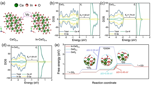 图5.(a)CeO2-x和In-CeO2-x的晶体结构,其中绿色、粉色和红色球代表Ce、In和O原子。(b–d)CeO2(b)、CeO2-x(c)和In-CeO2-x(d)的DOS。(e)原始CeO2、CeO2-x和In-CeO2-x催化CO2转化为CO时中间体的吉布斯自由能(ΔG)图。