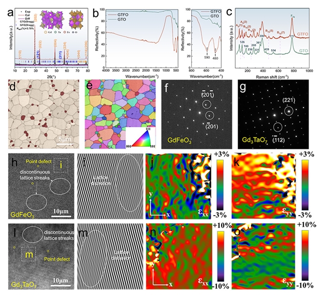 图1. a) GTFO样品的XRD Rietveld精修图谱;b) GTFO和GTO样品的傅里叶变换红外(FT-IR)光谱;c) GTFO和GTO样品的拉曼光谱;d) GTFO样品的EBSD物相分布图;e) GTFO样品主相对应EBSD反极图(IPF);f) GdFeO3区域的选区电子衍射(SAED)谱;g) Gd3TaO7区域的选区电子衍射(SAED)谱;h) GdFeO3区域的高分辨TEM(HRTEM)图像;i) (h)图中黄色方框区域的原子晶格像;j-k) 基于(h)图通过GPA方法获取的对应应变场分量εxx和εyy;l) Gd3TaO7区域的HRTEM图像;m) (l)图中黄色方框区域的原子晶格像;n-o) 基于(l)图通过GPA方法获取的对应应变场分量εxx和εyy