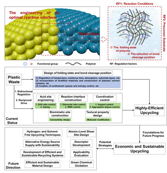 塑料废弃物的广泛积累加剧了环境退化,且破坏了资源的循环性。选择性热催化作为将废塑料转化为增值化学品的变革性途径,然而催化活性和产品选择性方面的持续挑战亟需系统性解决。本文综述了热解聚合的前沿进展,集中探讨了两个关键维度:原子尺度的活性位点工程——通过合理设计配位特征和界面结构调控C–C键断裂的能量学及中间体吸附;以及大分子尺度的聚合物瞬态状态调控——通过利用纳米限制效应、链折叠动力学和梯度热裂解作用加速转化动力学。我们进一步突出了原位表征技术的突破,揭示了催化体系中反应坐标随时间变化的演化过程。通过建立多尺度的结构-活性关系,将催化剂构型与聚合物动力学相联系,本分析提出了下一代增值系统的设计范式。这些原则为实现经济可行且工业可扩展的塑料增值提供了路径,并为碳循环经济的战略发展绘制了前进轨迹。