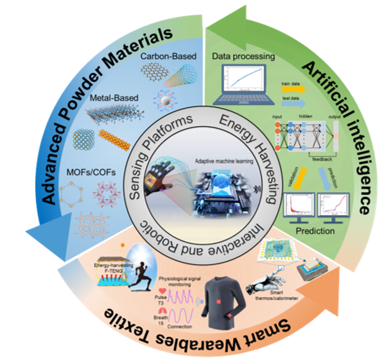 图1. AI辅助先进粉末材料在智能纺织品中的应用概览。